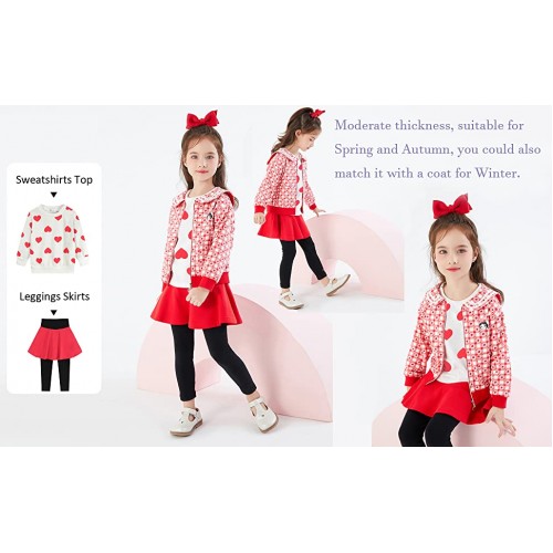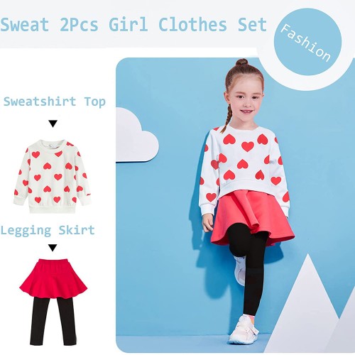 - Girls 2pcs outfits set including a long sleeve sweatshirts top and an elastic waistband leggings with skirts,stylish design,elastic waist for a better fit, crew neckline for easy to put on/off, red heart printed pattern for your lovely girls need, well printed,not fade.