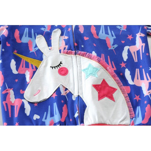 Pattern:Girls blue hooded sweatshirts, white pink cute unicorn print and embroidery zipper hoodies.Perfect match with pants, sweater.
