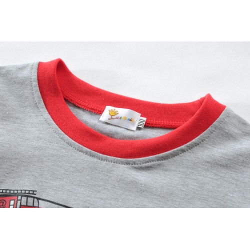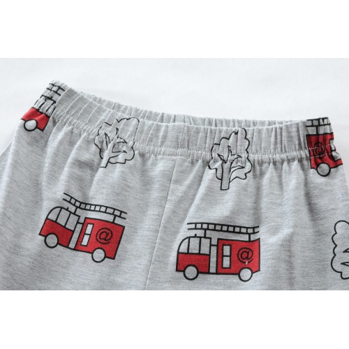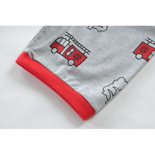 The pajama top features short sleeves, crewneck, contrast collar cuffs and red fire truck graphics printed on the front of the top. The shorts features fire truck all over print and an elastic waistband for added comfort and easy pull-on wear.